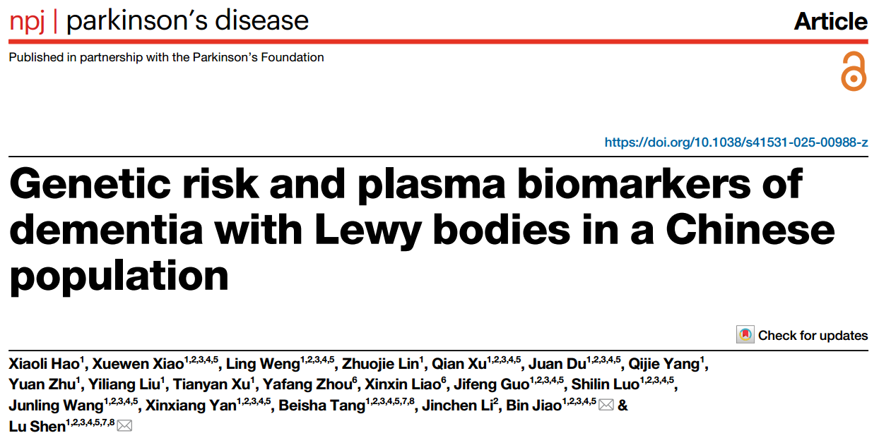 由中南大學(xué)湘雅醫(yī)院神經(jīng)內(nèi)科沈璐教授和焦斌教授共同通訊在《NPJ Parkinsons Disease》(IF=6.7)上發(fā)表了對(duì)中國(guó)人群路易體癡呆(DLB)的遺傳風(fēng)險(xiǎn)和血漿生物標(biāo)志物的研究。